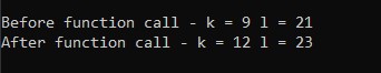 The variables k and l passed into the function by reference are permanently changed once the function is executed: