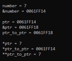 The last three lines of output is where it gets interesting. Deferencing ptr gives the value 7 as expected. However, dereferencing ptr_to_ptr gives the address of the variable number. This makes sense because applying the indirection operator gets the value stored at the address the pointer contains. In this case, since we are pointing to a pointer, another address is returned. To obtain the value at the address stored by the pointer we’re pointing to, the indirection operator has to be applied again. So the syntax **ptr_to_ptr is used, and the value 7 is obtained.